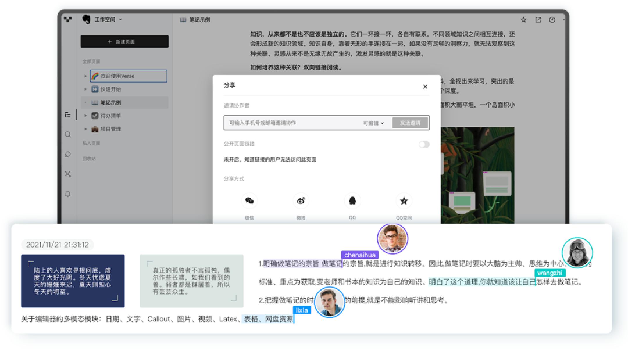 在当下疫情形成的长途作业新协同需求大布景下,「Verse」还支撑个人空间与页面同享,完成多人实时协作互动,助力打造高效团队。在这里,团队成员同享信息、共创常识、共建常识库,完成思维的自在磕碰。